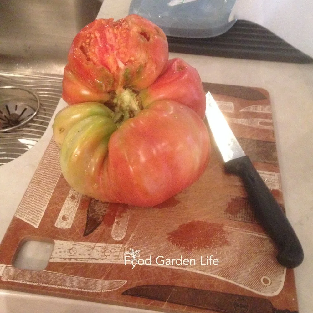 We should have picked this tomato a couple of days earlier, and then we would have had the whole thing…but we left it until it was pretty ripe, and a squirrel ate part of it.
