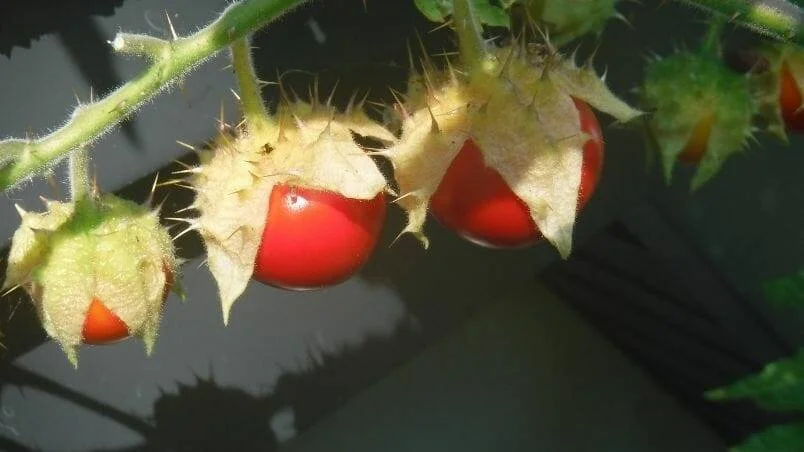 Litchi tomato is covered by spines. The covering finally opens as the fruit ripens. They’re a great crop where there are heavy squirrel pressures.