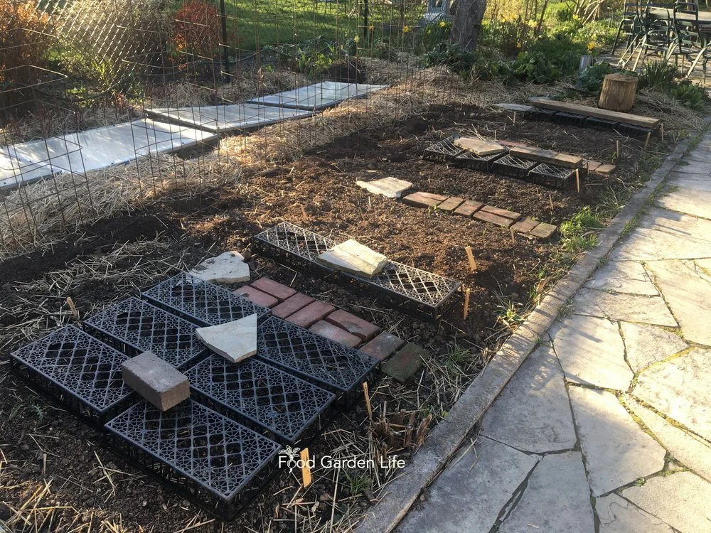 Plastic web trays that are used for transporting plants are a simple way to protect newly planted areas of the garden from digging squirrels.