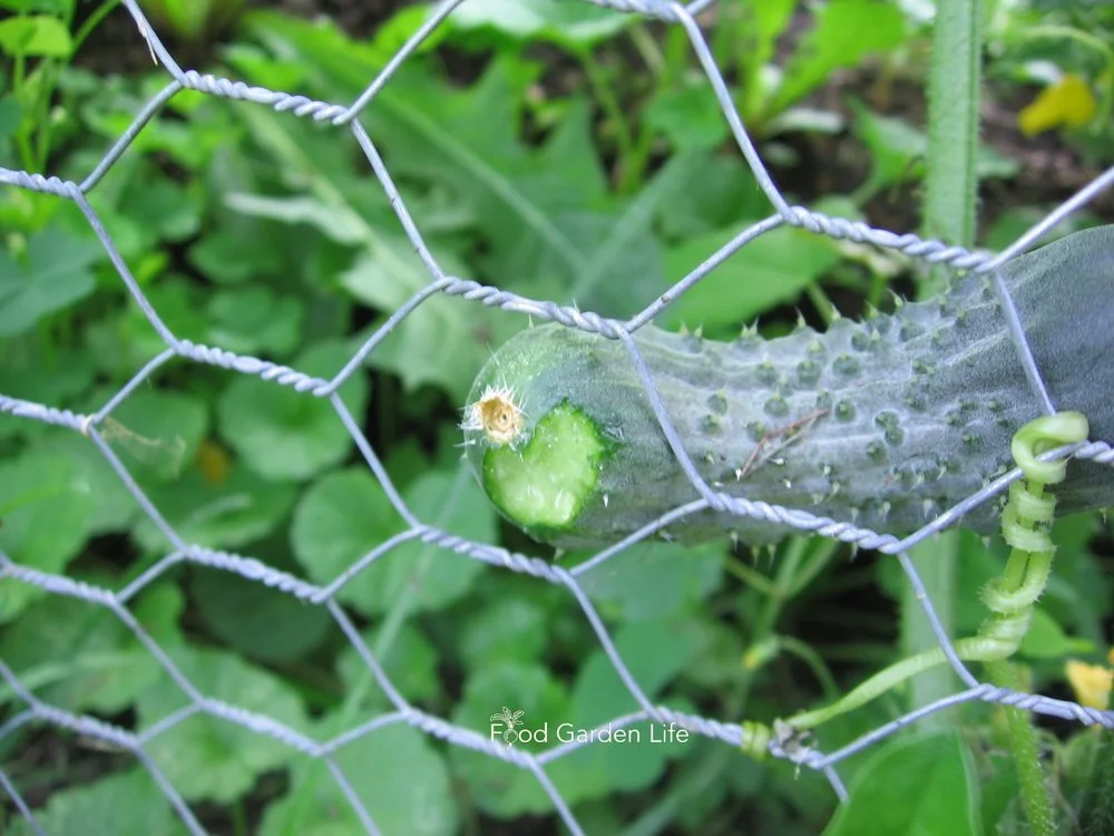 Bottled Up. Thanks to a reader for this squirrel proofing hack for cucumbers. Take a 2-litre pop bottle, remove the label, and punch a few drainage/ventilation holes. (Soldering iron works well!) Once a cuke has formed, insert it into the bottle. If the plant is trellised, tie the bottle to the trellis. For really long English cukes (or luffa gourds or snake gourds), cut off the bottom of the bottle to allow it to grow longer. Or, force-fit your gourds into the shape of the 2L bottle! (Thank you Jurgen!)