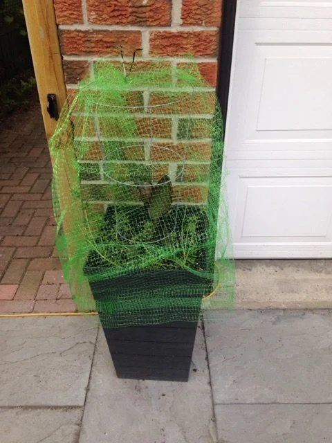 Plastic bird netting to keep squirrels away from a flower pot.