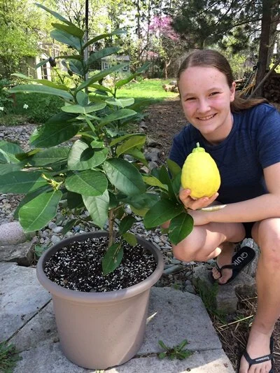 My daughter with a Ponderosa lemon tree and a lemon harvested in the spring. Note the smaller lemons that will ripen later in the year.