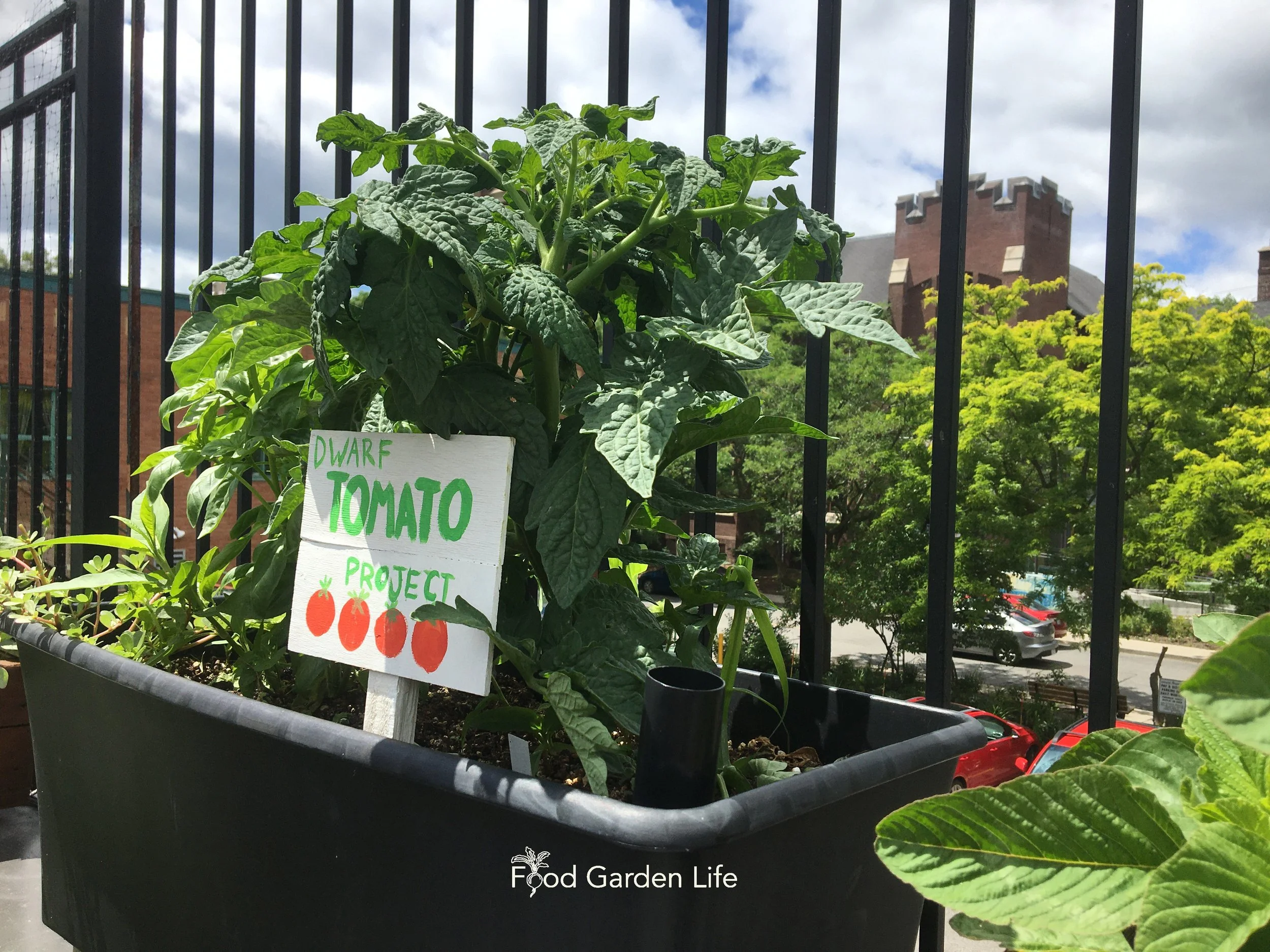 Dwarf tomatoes growing in a rooftop container. No need for staking or support!