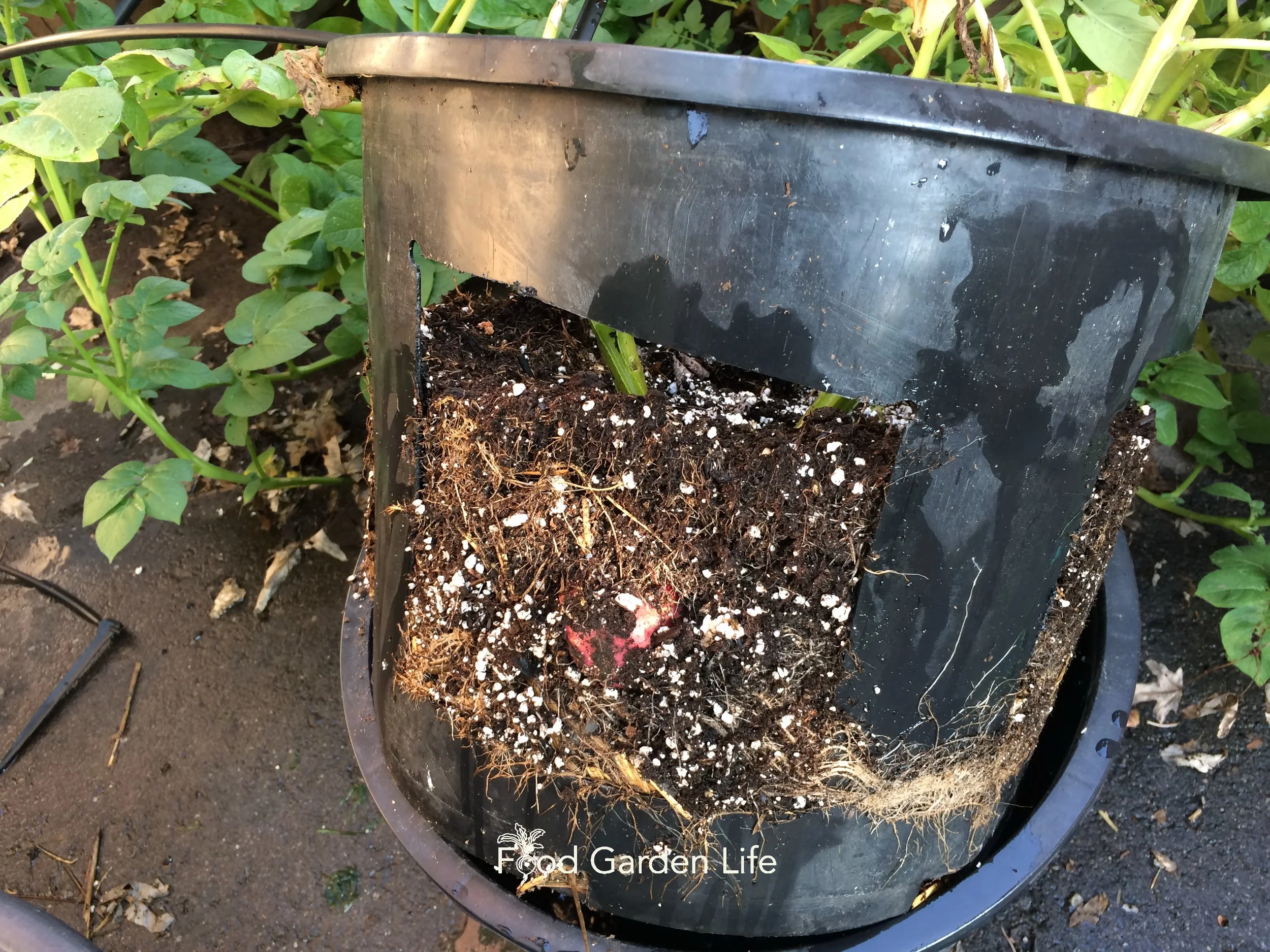 Check out this potato pot! I made it by cutting holes into a nursery pot, and then sliding the nursery pot into another one of the same size.