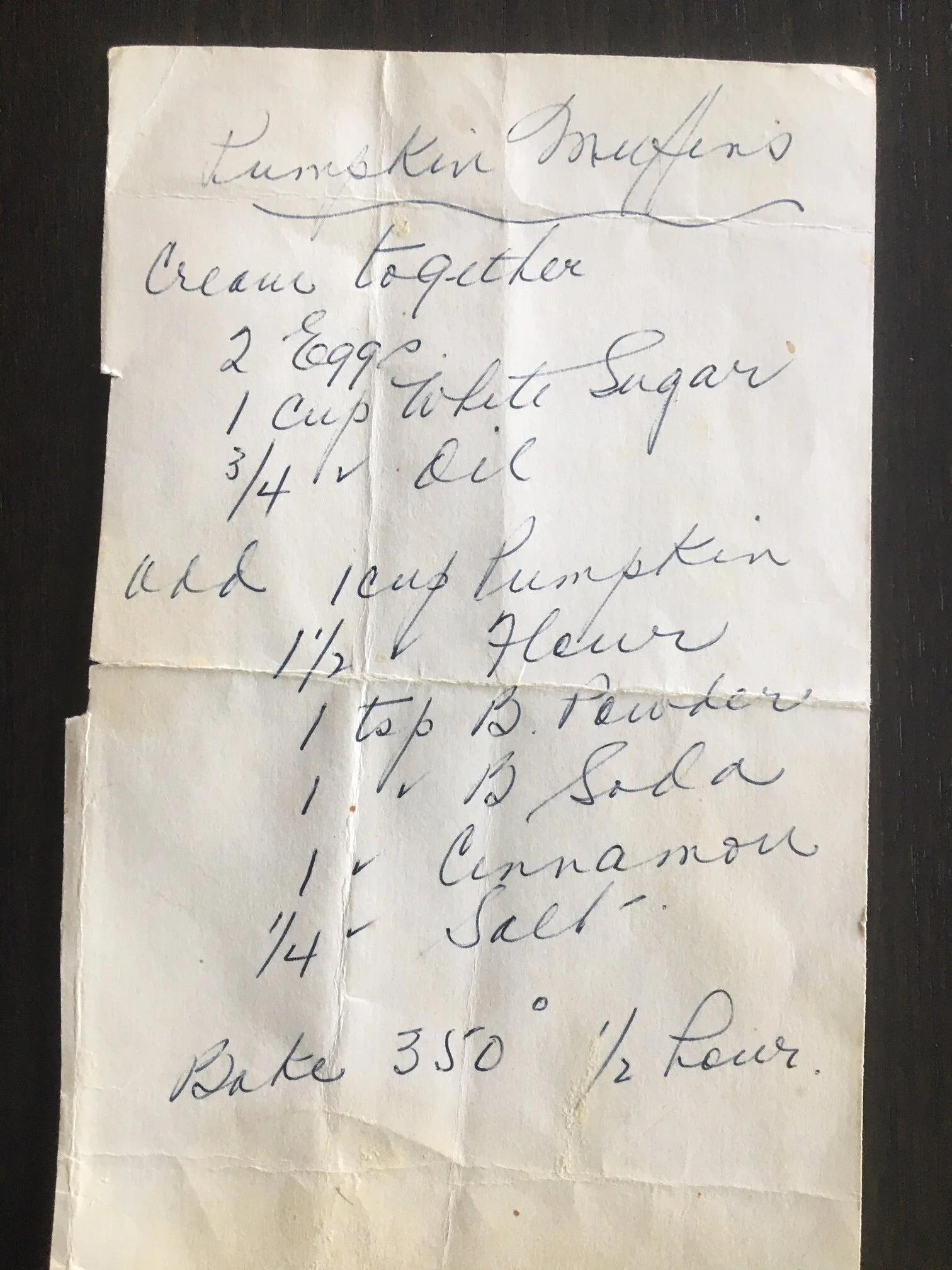 Nana Biggs’ pumpkin muffin recipe. (I usually cut the sugar in half and add raisins and nuts.)