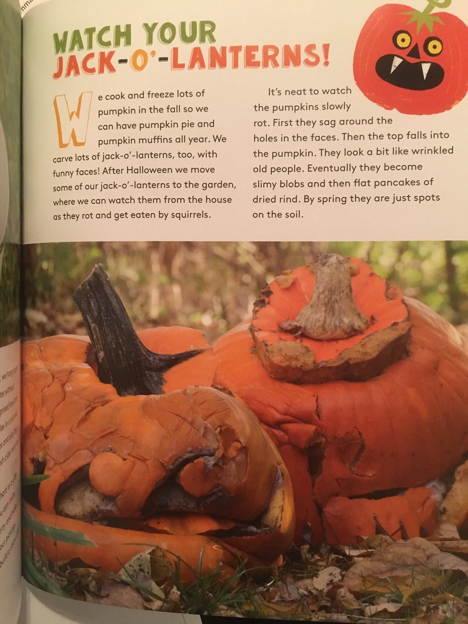 In my daughter Emma’s book, Gardening with Emma, she tells kids how pumpkins in the garden start to sag, and then become spots on the soil by spring.